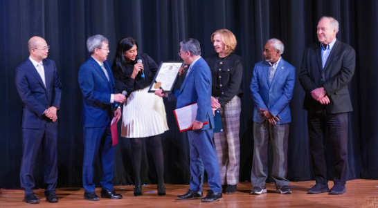 员会主席 Yang Yu,蒙郡郡长 Marc Elrich,蒙郡教育委员会主任 Julie Yang,以及