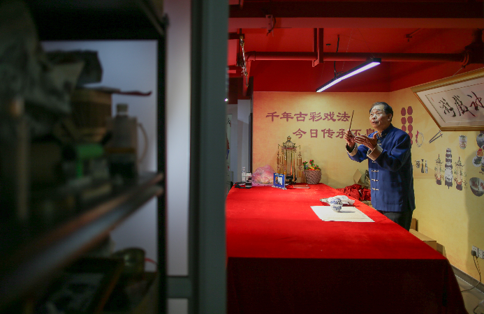 肖桂森在其工作室展示传统中国古彩戏法“三仙归洞” 记者 佟郁 摄