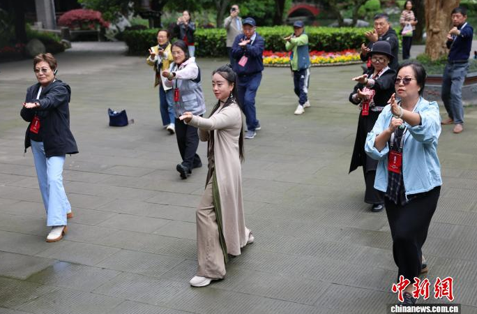 4月13日,来自全球17个国家和地区的20余家海外华文媒体代表走进四川都江堰,参观2000余年历史的水利工程、体验青城武术。图为华文媒体代表学习体验青城武术。中新社记者 张浪 摄