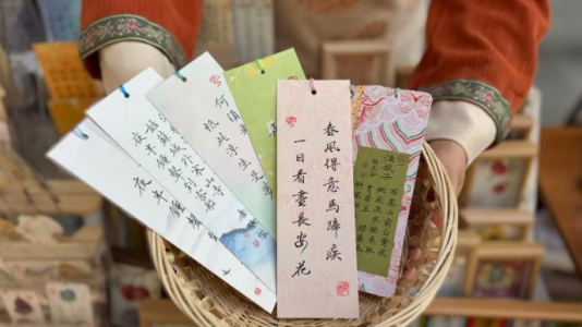 在西安“书院门”文化街区经营文创店的张钰向记者展示正在制作的唐诗书签。杨英琦 摄 在西安城墙根下“书院门”文化街区的一家文创店里,几张铺满宣纸的小桌前经常围满了人,从“春风得意马蹄疾”到“天涯共此时”,游客们在这里可以得到手写的唐诗书签。这些精美的书签成为这座古都轻盈而富有诗意的伴手礼。...