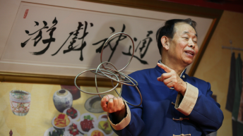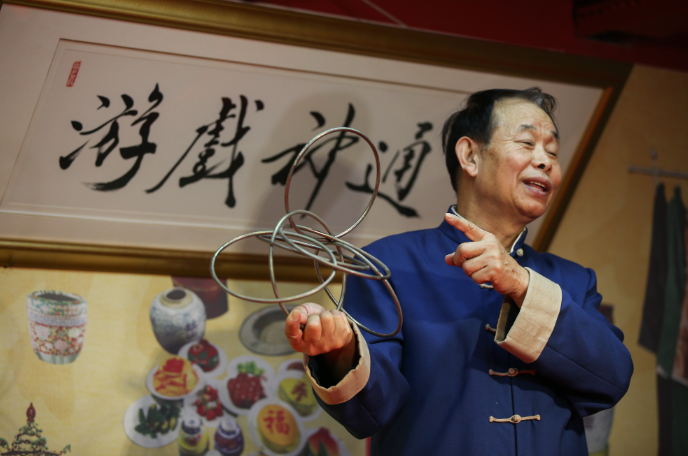 近日,在天津戏剧博物馆,红绸遮身,探手入怀,一摞鱼缸便“凭空”现身。水纹轻晃,金鱼摆尾,银鳞闪过。围观者愣了半拍,随即笑声起落:这缸鱼从哪儿来?   “这套叫《金玉满堂》,是典型的大戏法,也叫‘落活’。”戏法代表性传承人肖桂森告诉中新社记者,戏法讲究的不是吓人一跳,而是把彩头一件件“请”出来:鱼先来,寓意“有余”;随后碟盘、海会、火盆接续登场,热闹越叠越满,才有“金玉满堂”的好口彩。...